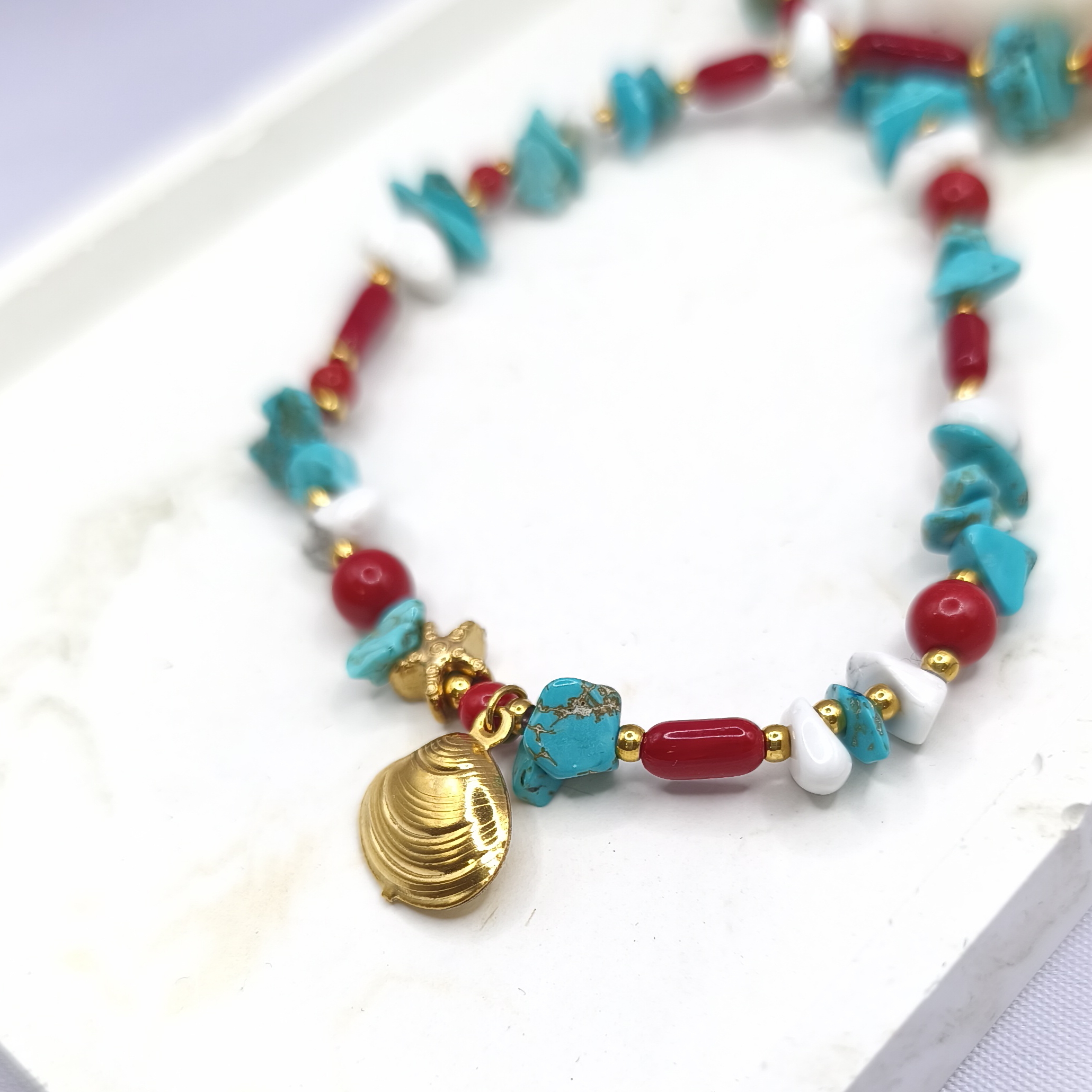Χειροποίητο κολιέ με αστερία και κοχύλι ατσάλι. Χάντρες φυσικό κοράλλι, τσιπς τυρκουάζ χαολιτης και τσιπς λευκό χαουλιτη. Χάντρες ατσάλι.