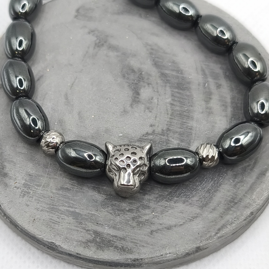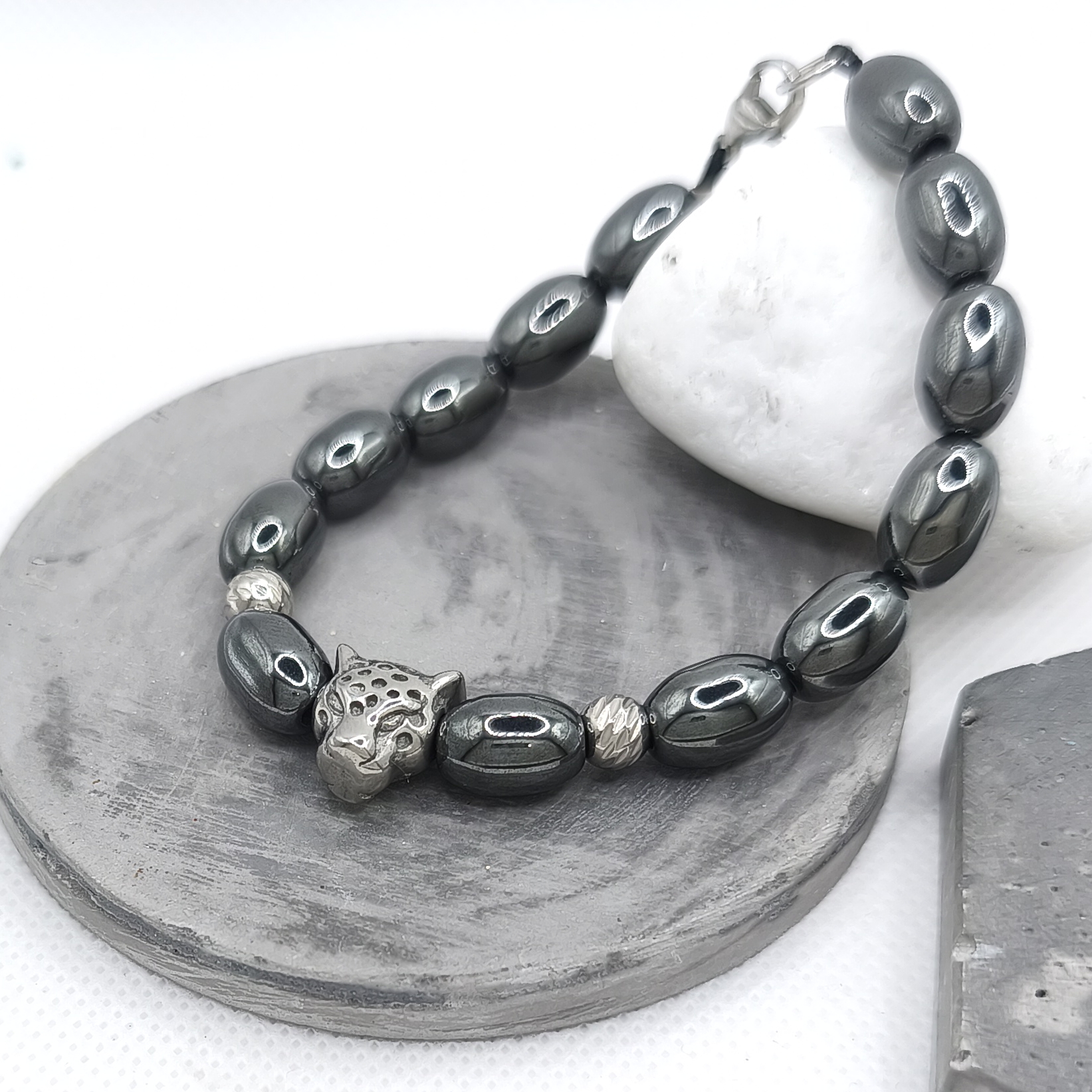 Χειροποίητο βραχιόλι με οβάλ χάντρες αιματίτη και κεφάλι τίγρη ατσάλι Κούμπωμα ατσάλι.