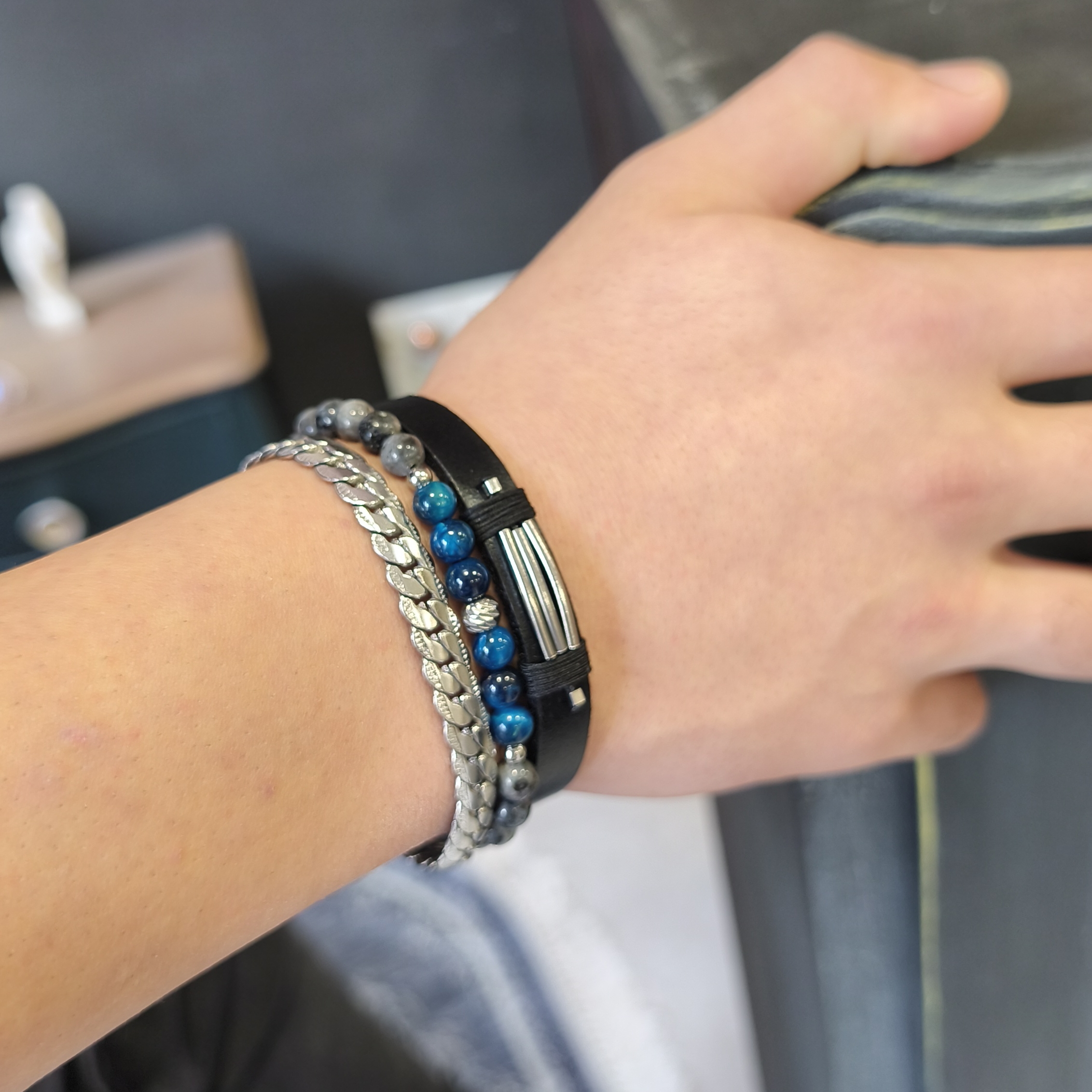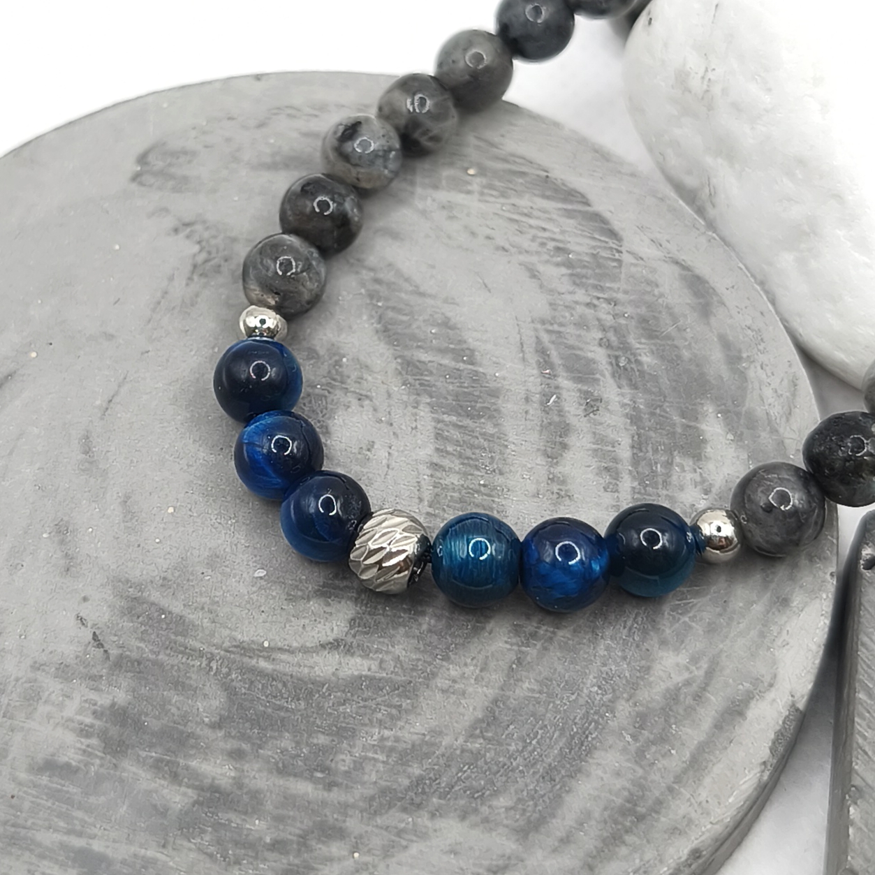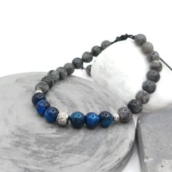 Χειροποίητο βραχιόλι με χάντρες ατσάλι, λαμπραδορίτη και μάτι τίγρης σε μπλε χρώμα