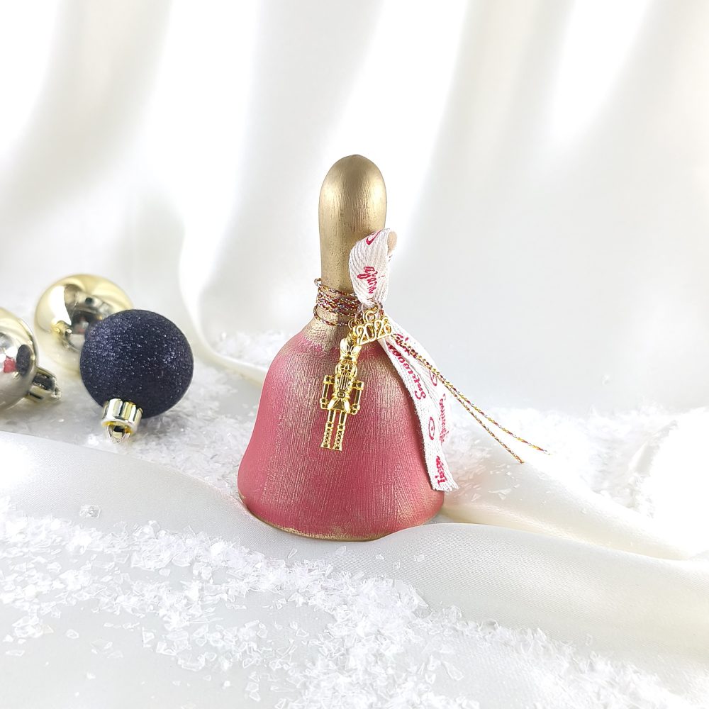 Χειροποίητη καμπάνα κεραμική κόκκινη με χρυσή πατίνα. Μεταλλικός καρυοθραύστης , μεταλλικό “2026” και κορδέλα με ευχές.