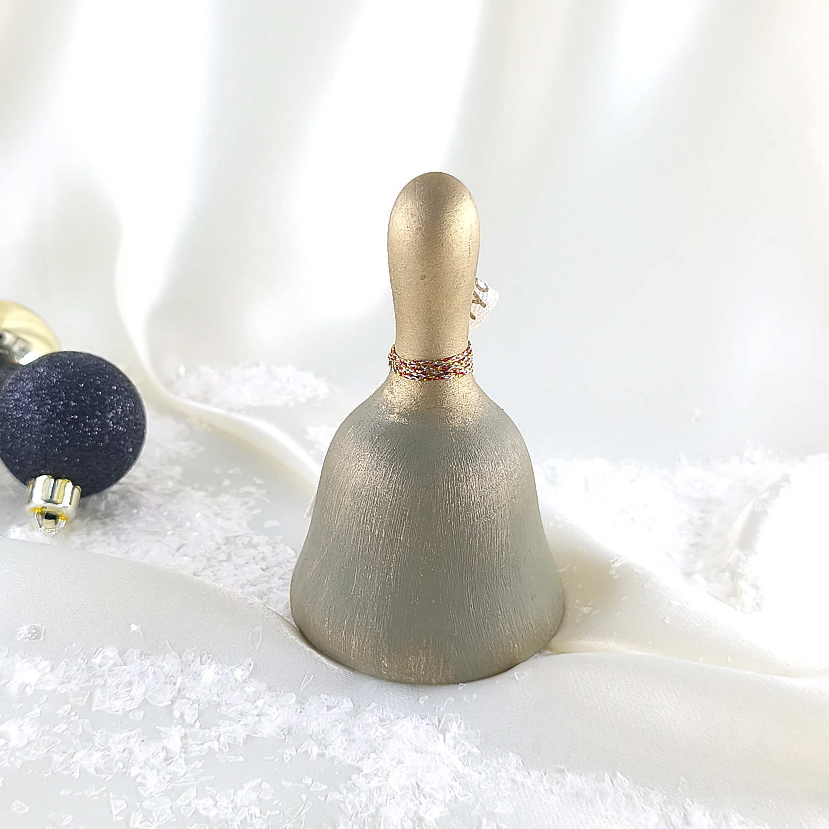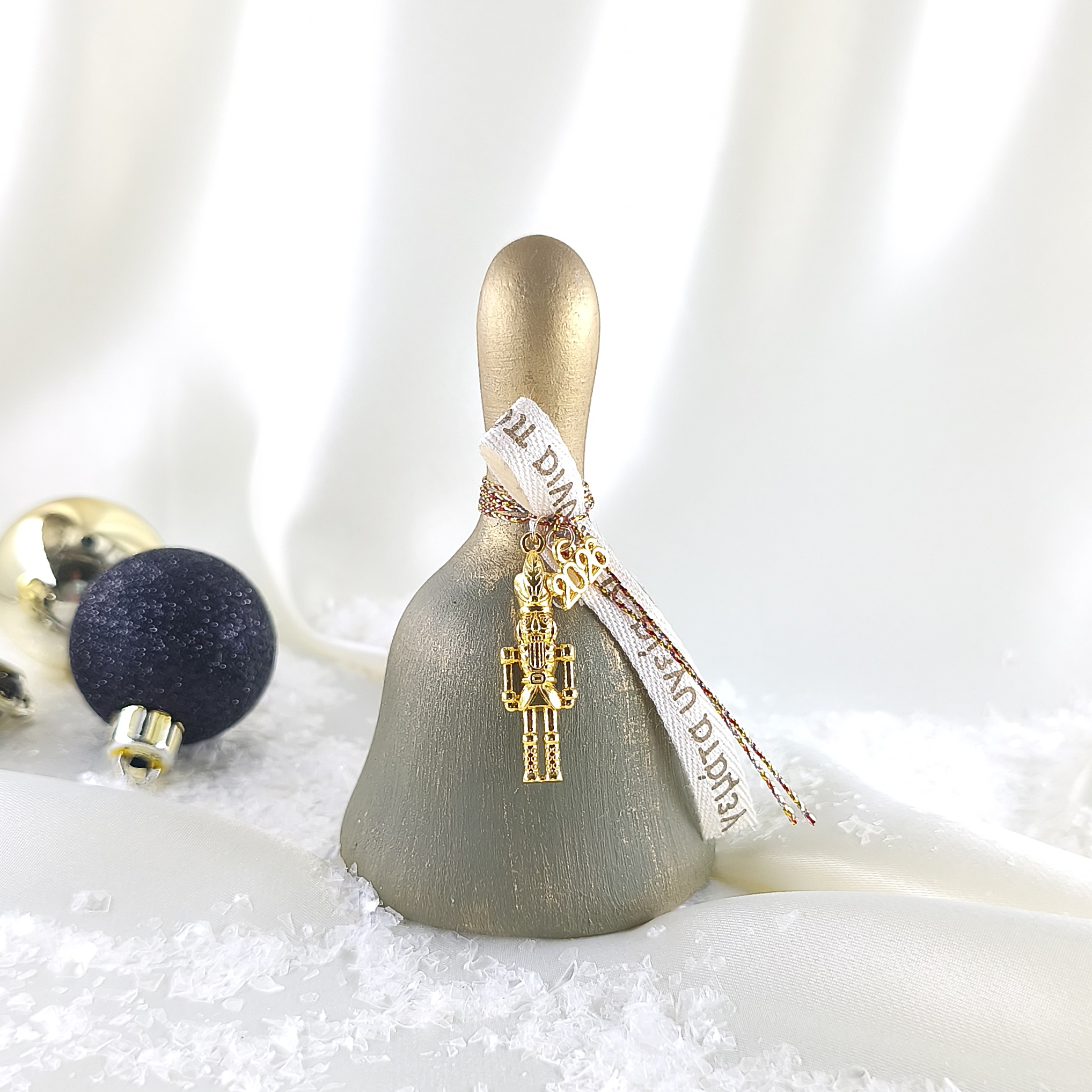 Χειροποίητη καμπάνα κεραμική πράσινη με χρυσή πατίνα. Μεταλλικός καρυοθραύστης , μεταλλικό “2026” και κορδέλα με ευχές.
