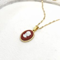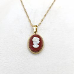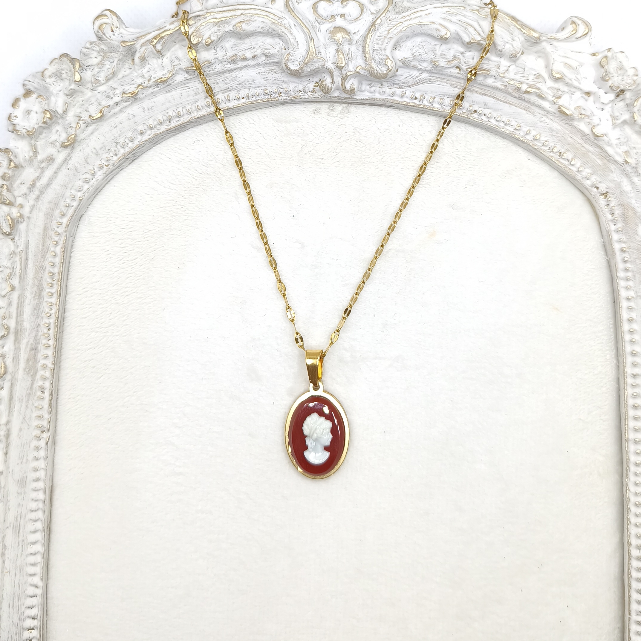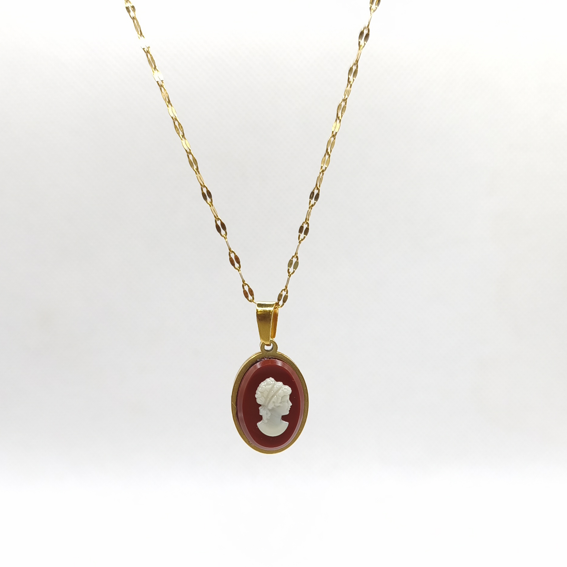 Χειροποίητο κολιέ με ατσάλινη αλυσίδα, cameo ατσάλι με μπορντό πέτρα.
