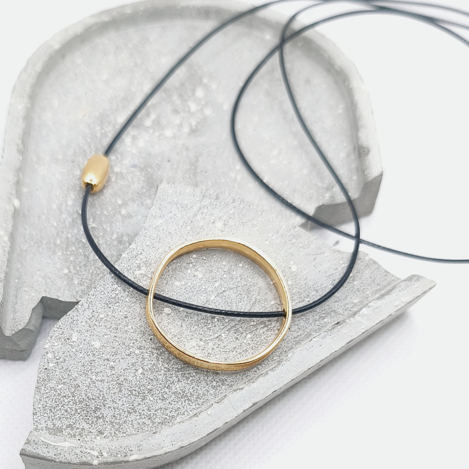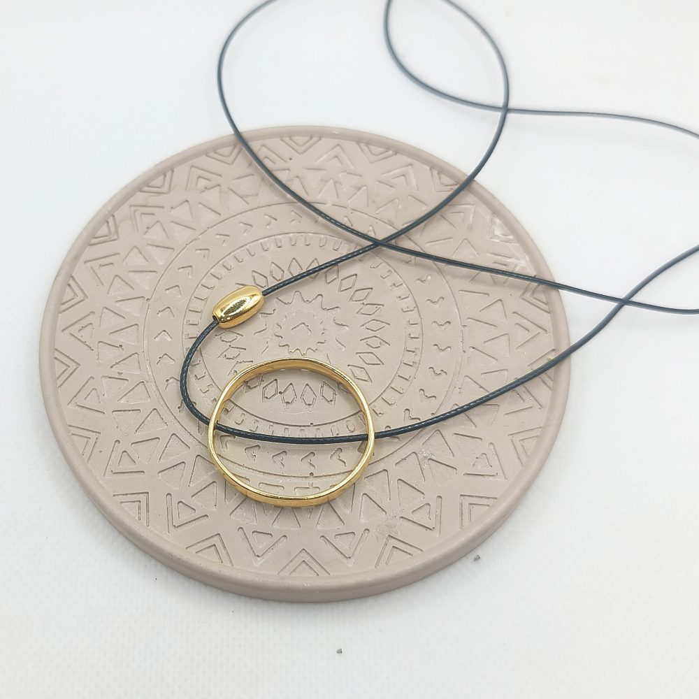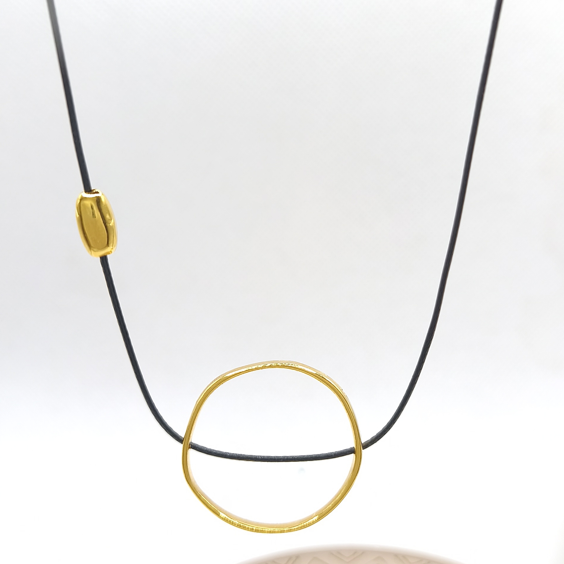 Μακρύ χειροποίητο κολιέ με μαύρο κορδόνι ,επιχρυσωμένος κύκλος και επιχρυσωμένο ενωτικό.