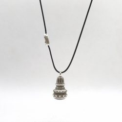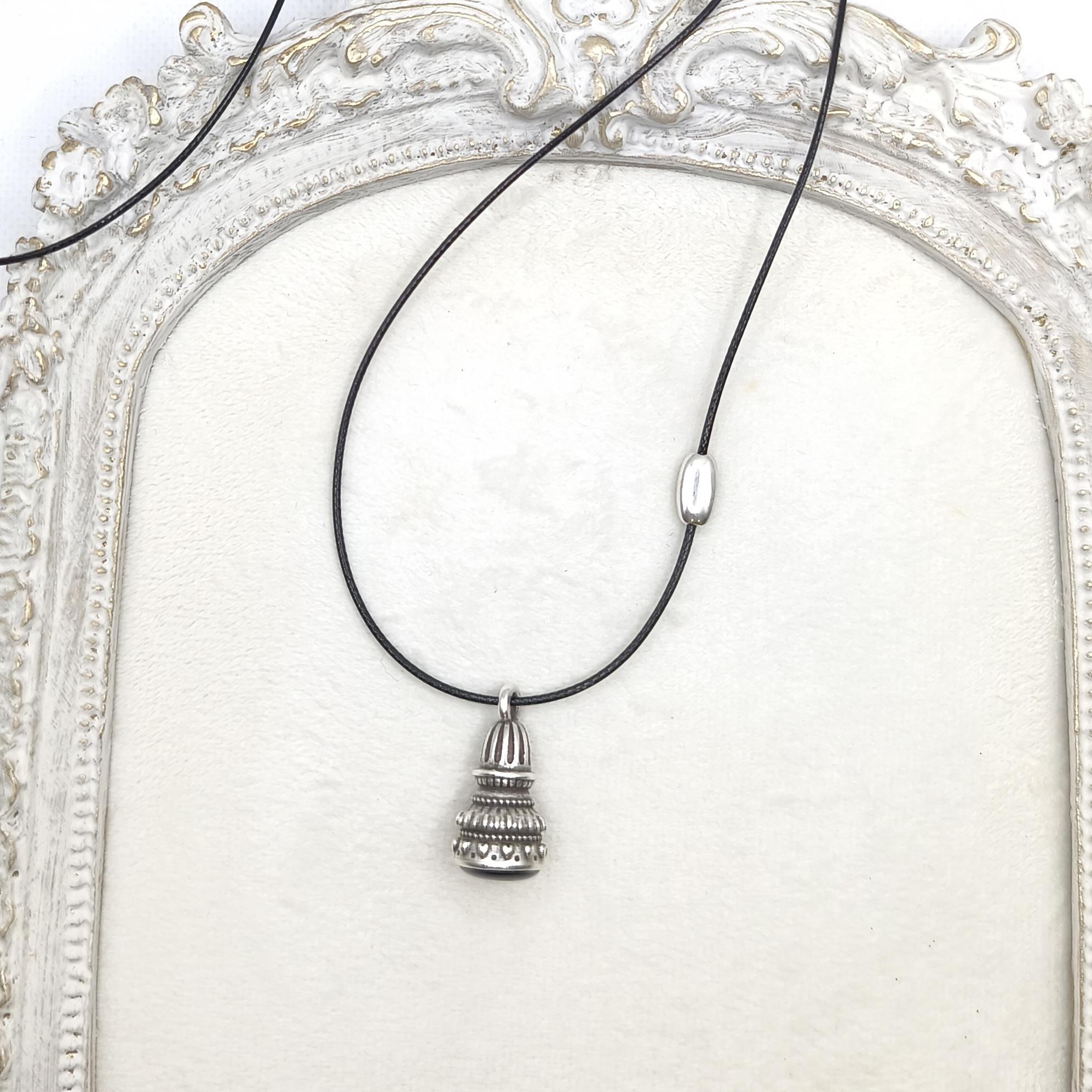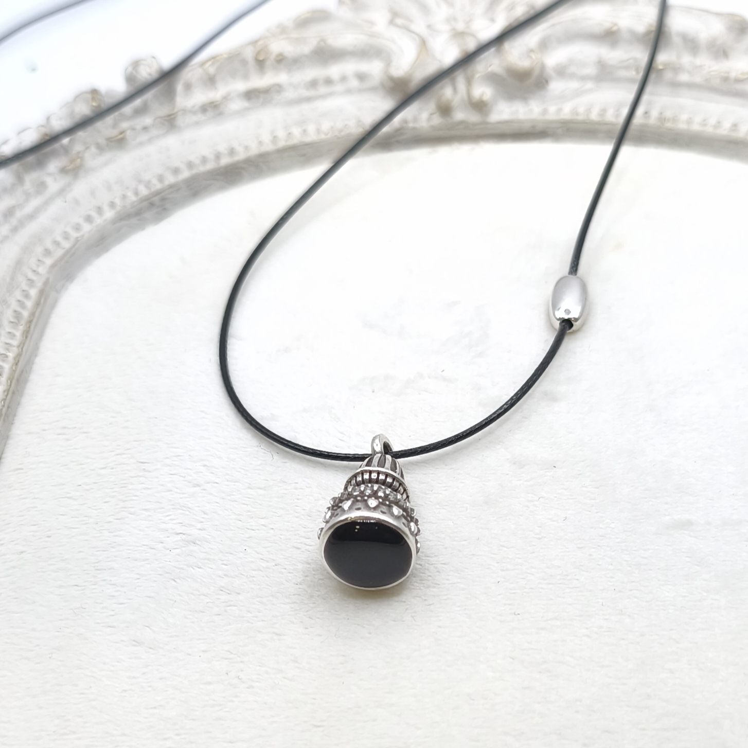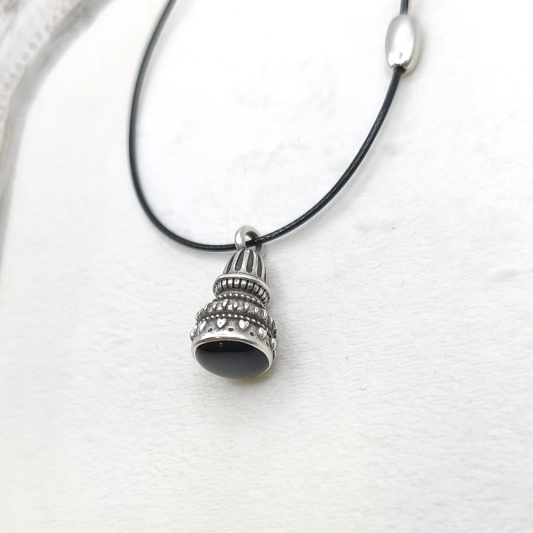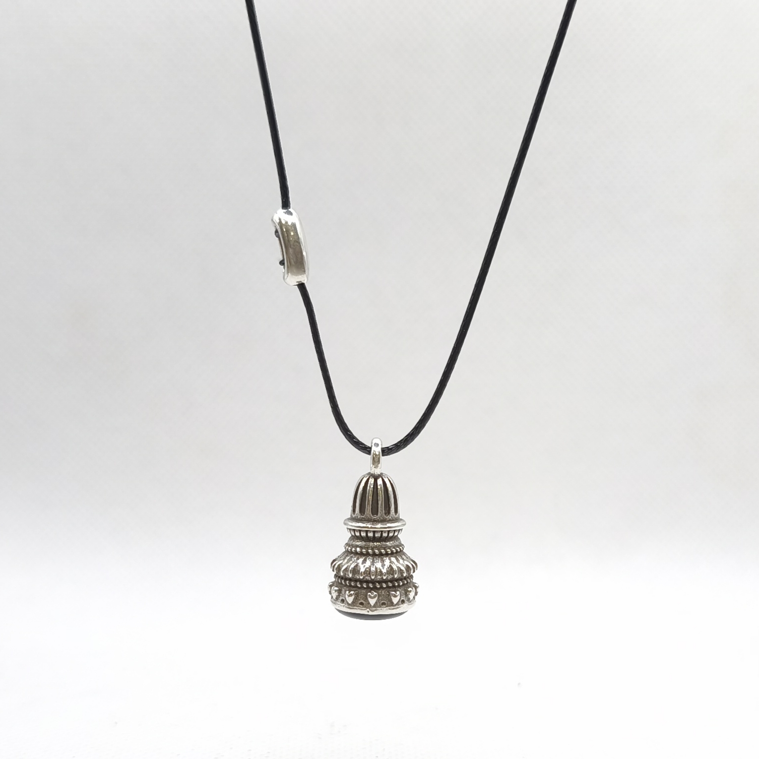 Μακρύ χειροποίητο κολιέ με μαύρο κορδόνι ,επαργυρωμένο κρεμαστό στοιχείο με μαύρο σμάλτο και επαργυρωμένο ενωτικό.