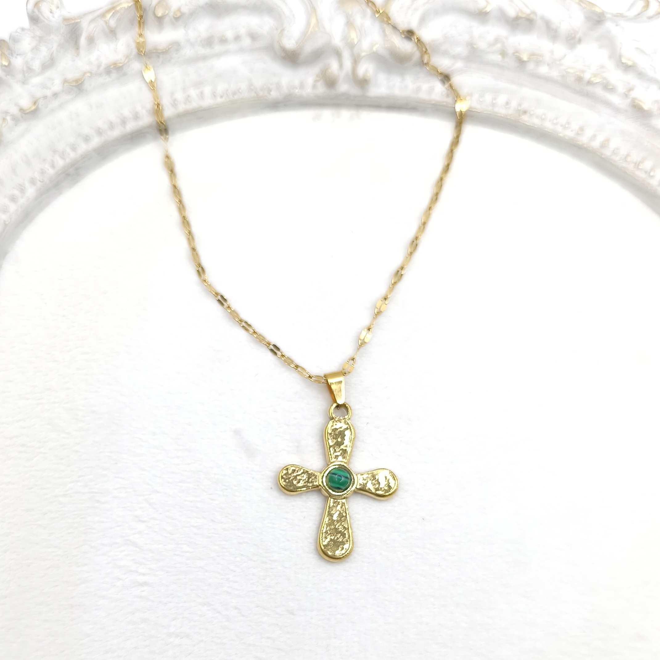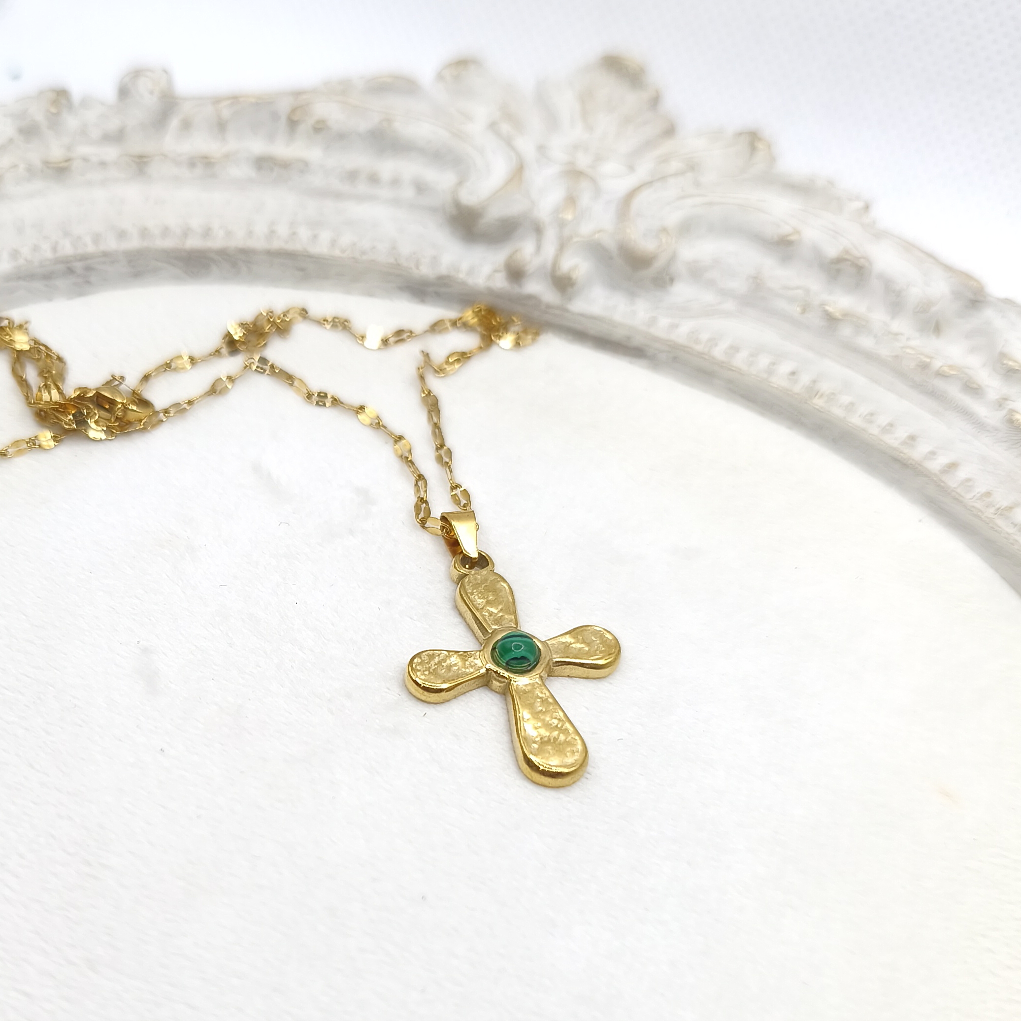 Κολιέ σταυρός ατσάλι με πέτρα μαλαχίτη