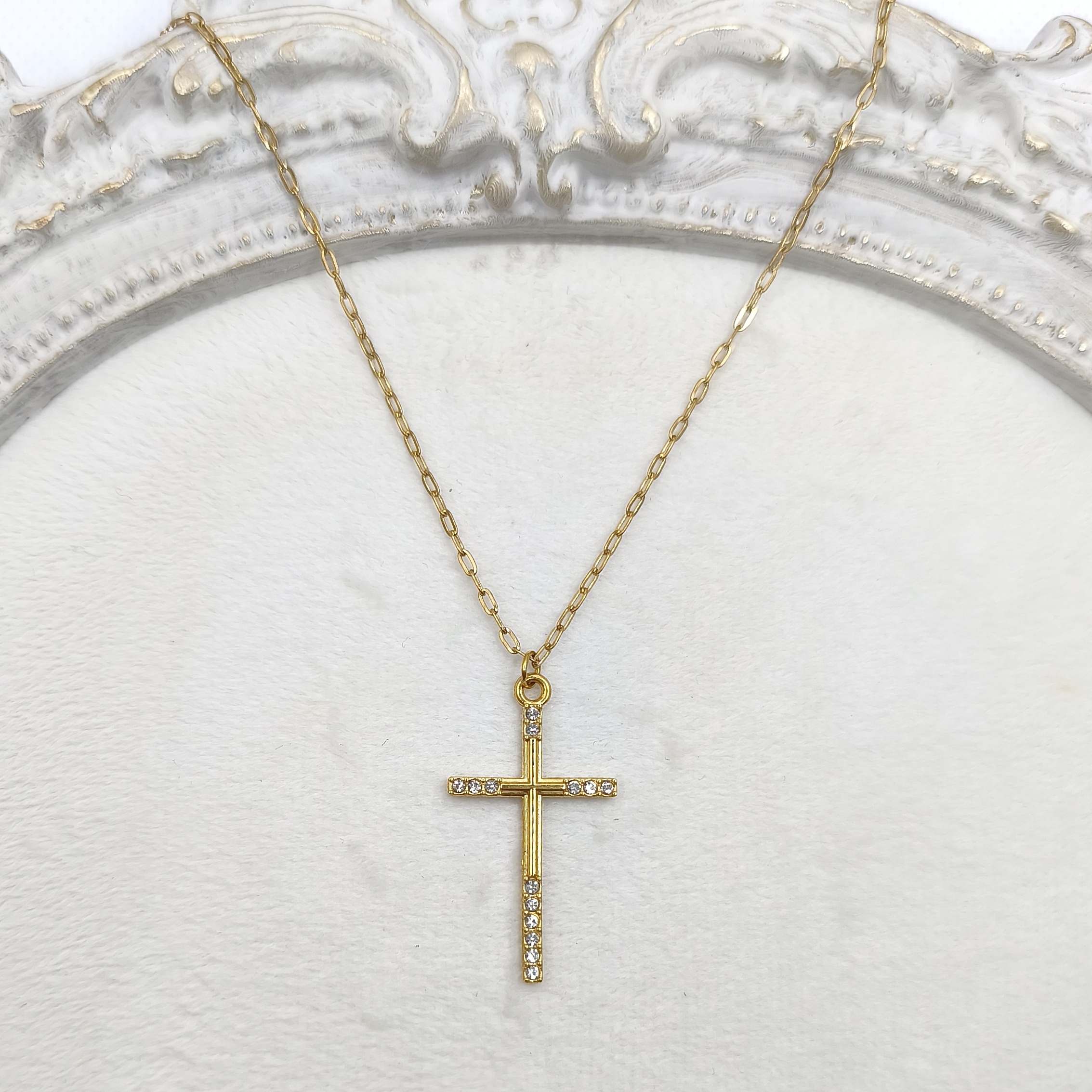 Χειροποίητο κολιέ από ανοξείδωτο ατσάλι. Σταυρός 3 εκατοστά ατσάλι με στρας