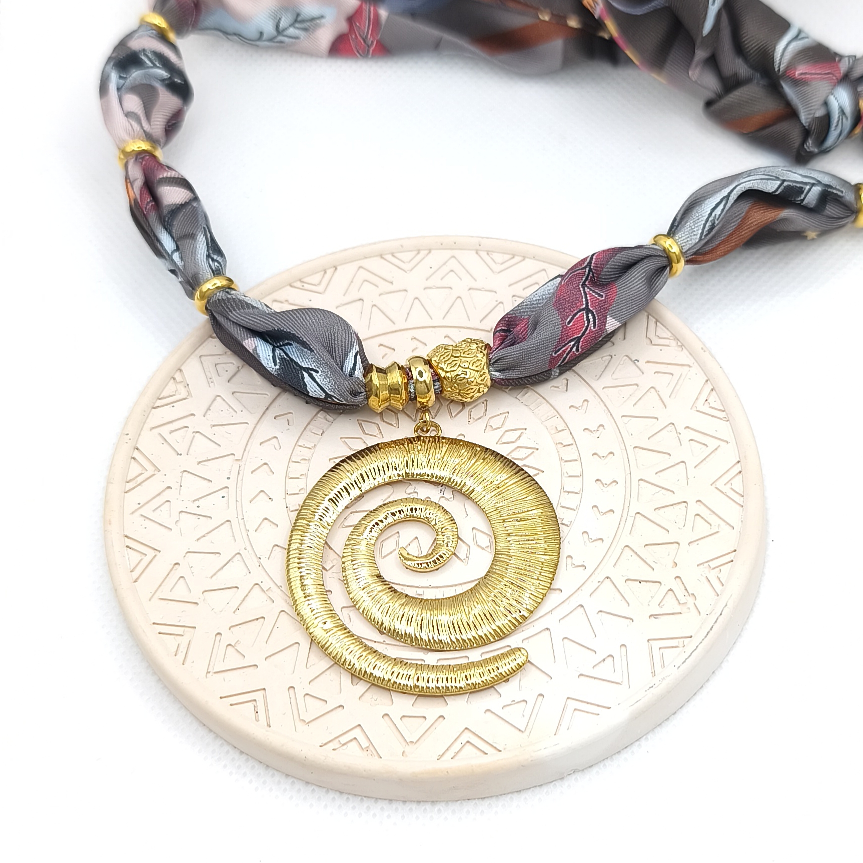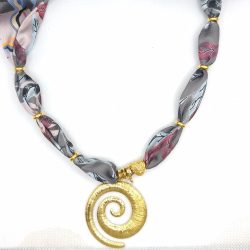 Χειροποίητο κολιέ με φουλάρι από τεχνητό μετάξι χάντρες και μεγάλο στοιχείο όλα ατσάλι.