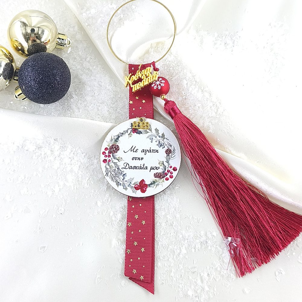 Μπορντό κρεμαστό γούρι με μακριά φούντα, μεταλλικό Χρόνια πολλά και ξύλινο Χριστουγεννιάτικο μοτίφ “Με αγάπη στη δασκάλα μου”