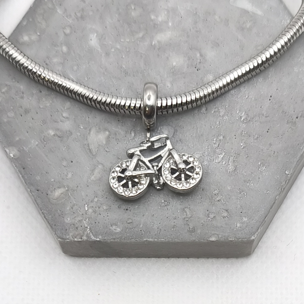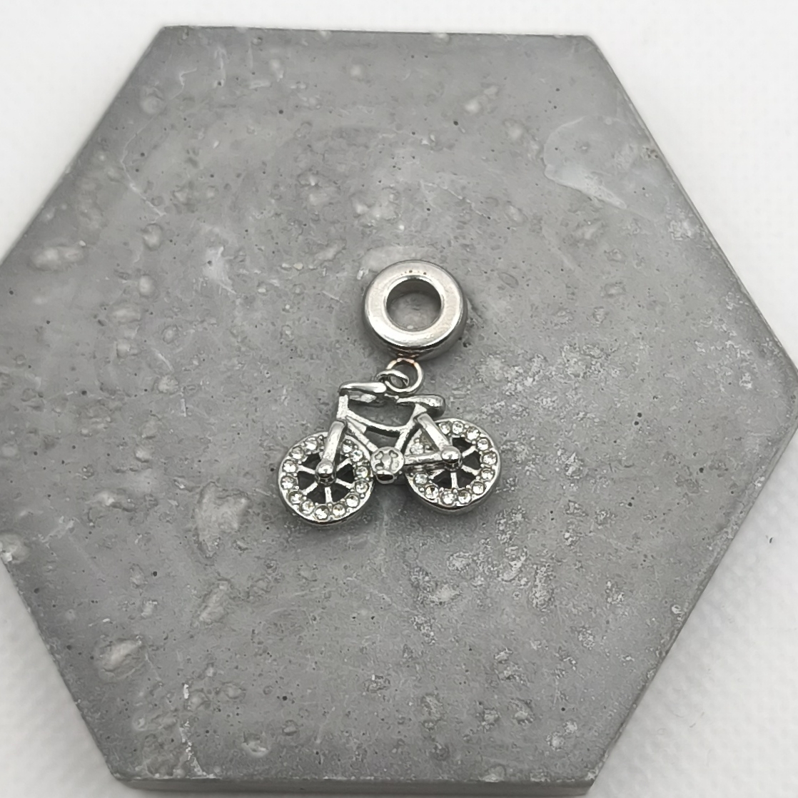 Charm ατσάλι με κρεμαστό ποδήλατο και με διάφανα στρας στο περίγραμμα των ροδών του.