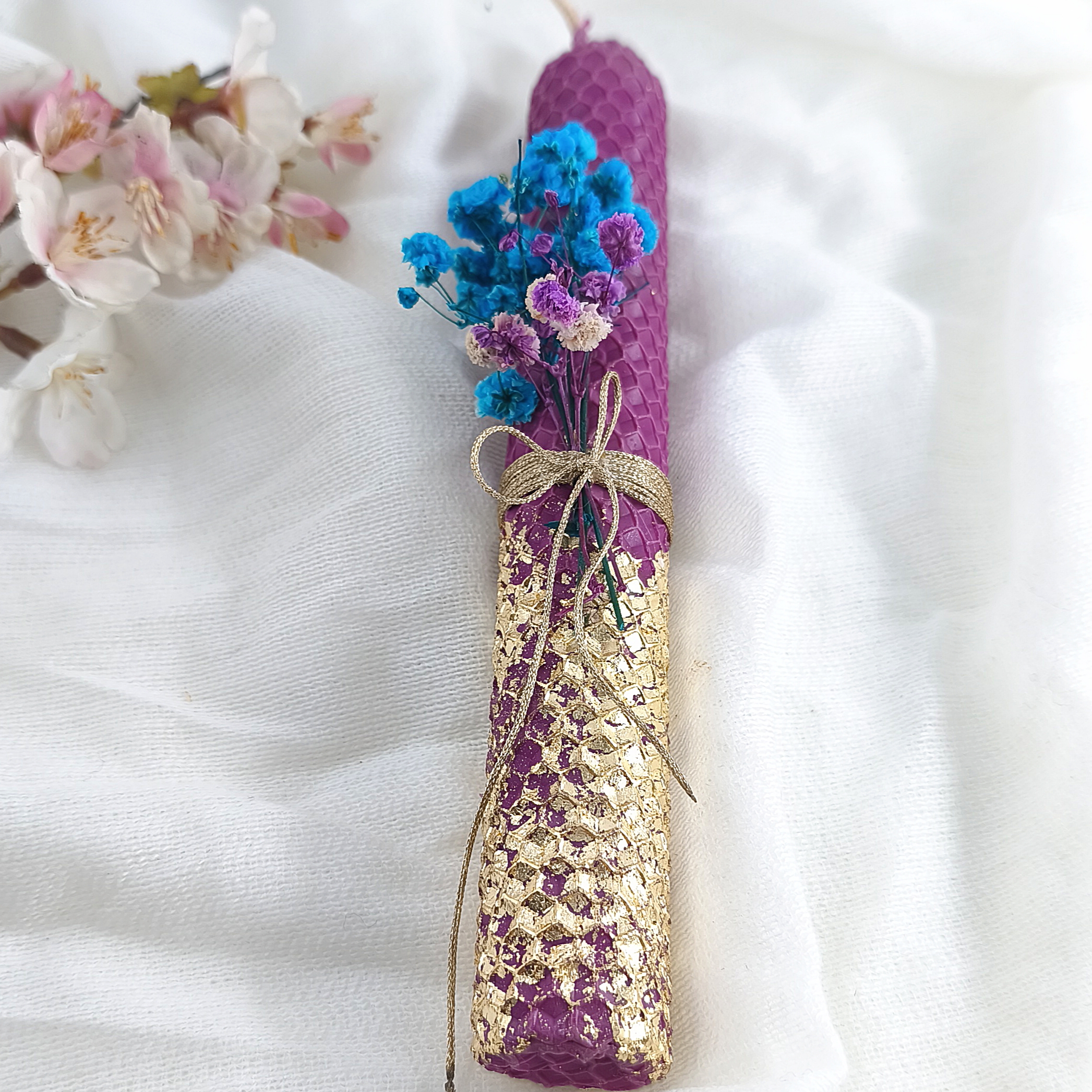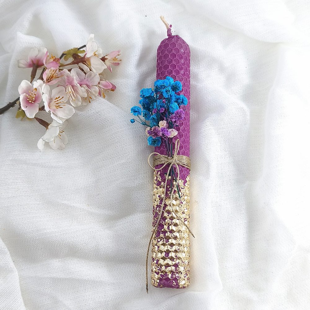 Λαμπάδα μελισοκέρι με φύλλο χρυσού και αποξηραμένα λουλούδια.