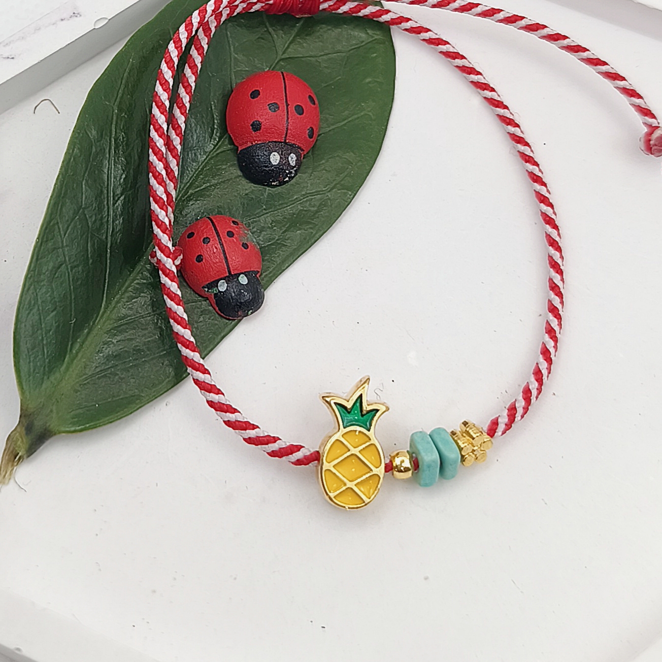 Χειροποίητο βραχιόλι μαρτάκι με πολυεστερικό κορδόνι, επιχρυσωμένος ανανάς με σμάλτο, κεραμικές χάντρες και επιχρυσωμένο λουλούδι