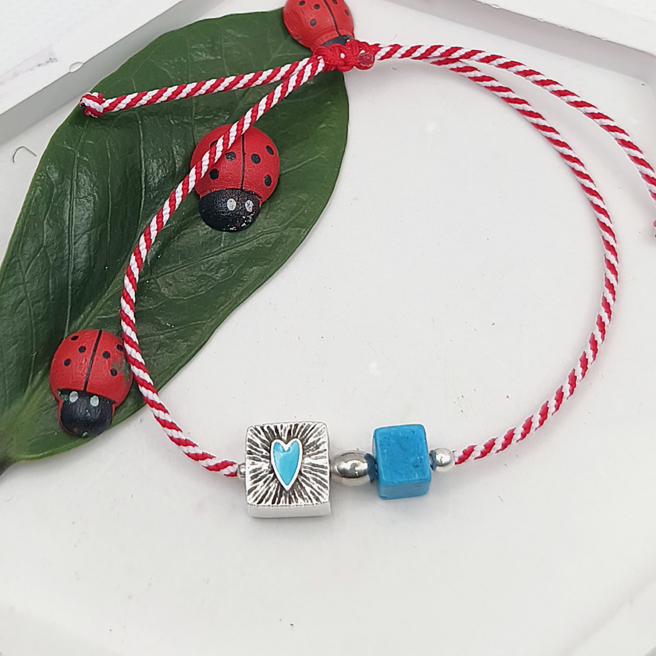 Χειροποίητο βραχιόλι μαρτάκι με πολυεστερικό κορδόνι, επαργυρωμένη τετράγωνη χάντρα καρδιά και κύβος χαουλίτης