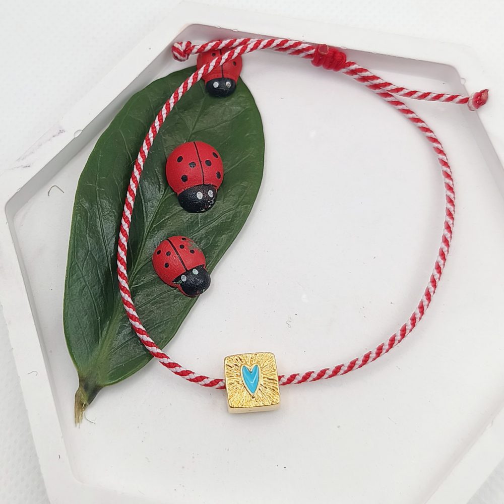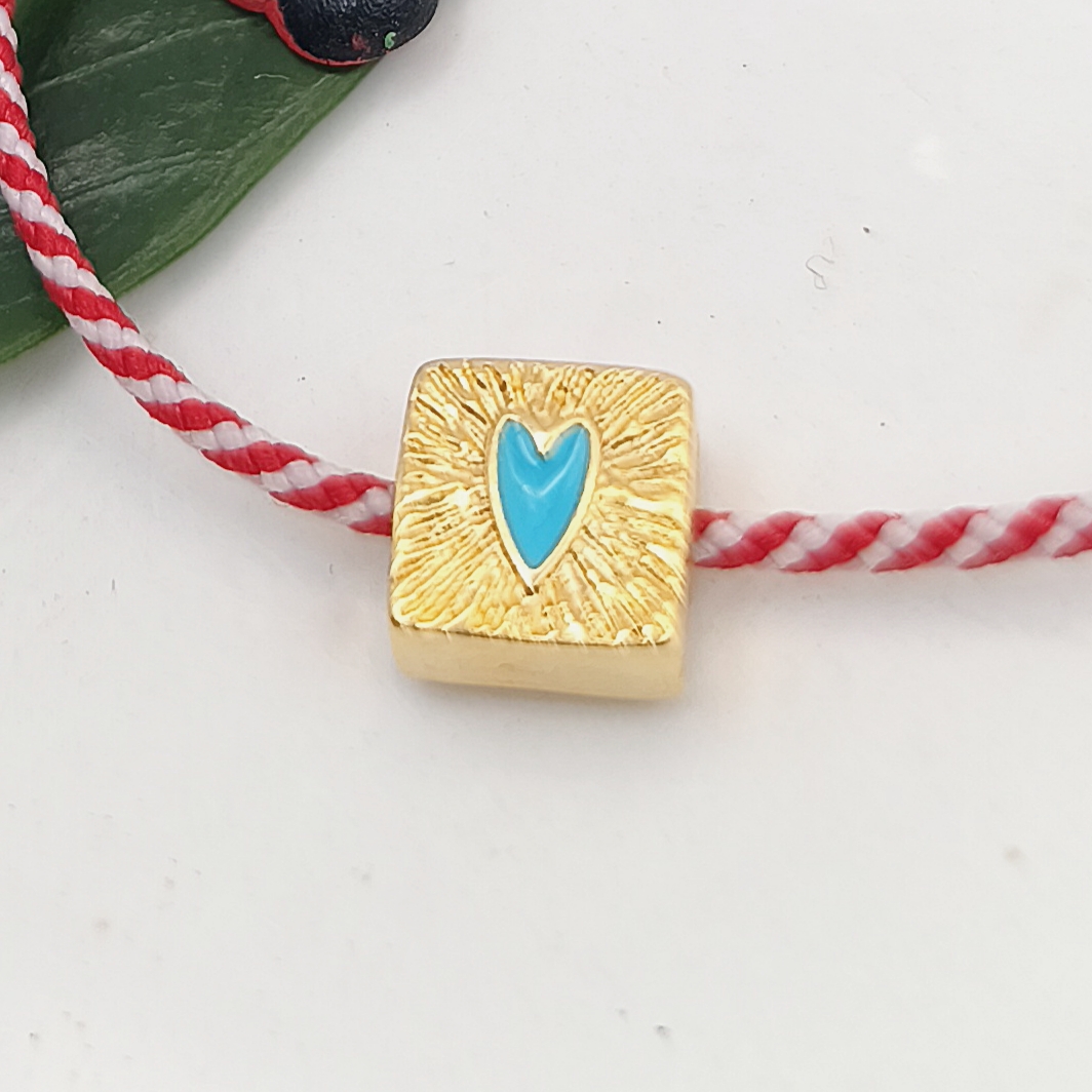 Χειροποίητο βραχιόλι μαρτάκι με πολυεστερικό κορδόνι, επιχρυσωμένη τετράγωνη σαγρέ χάντρα με καρδιά σμάλτο τυρκουάζ