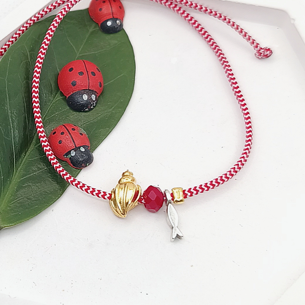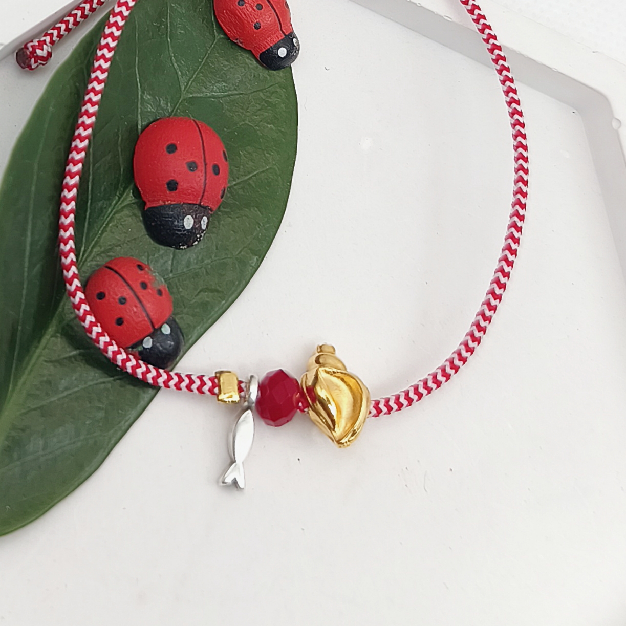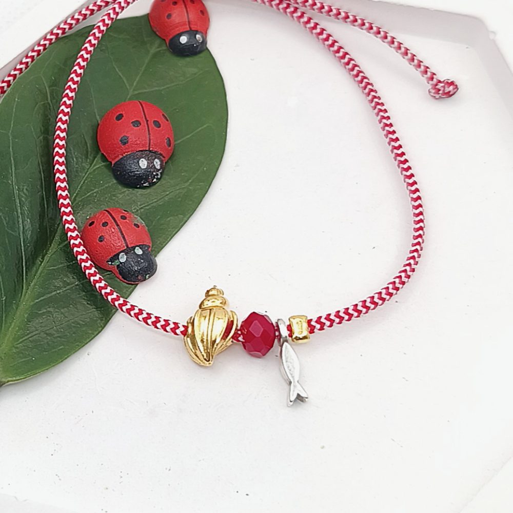 Χειροποίητο βραχιόλι μαρτάκι με πολυεστερικό κορδόνι, επιχρυσωμένο κοχύλι, κόκκινη χάντρα και επαργυρωμένο ψάρι.