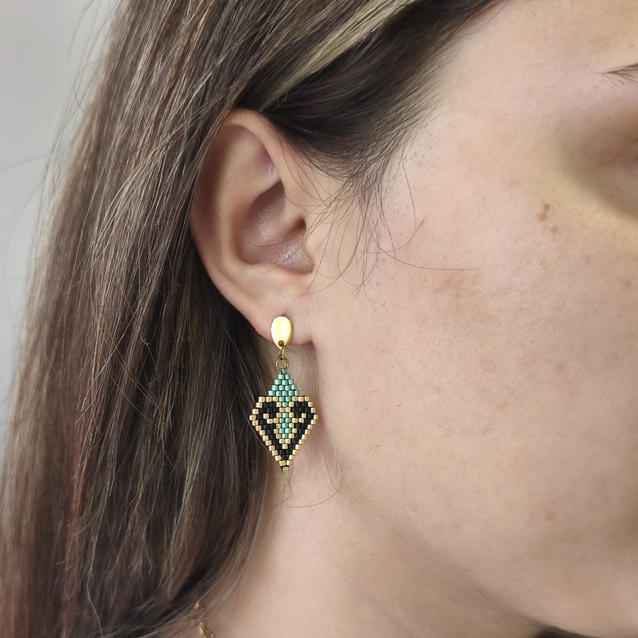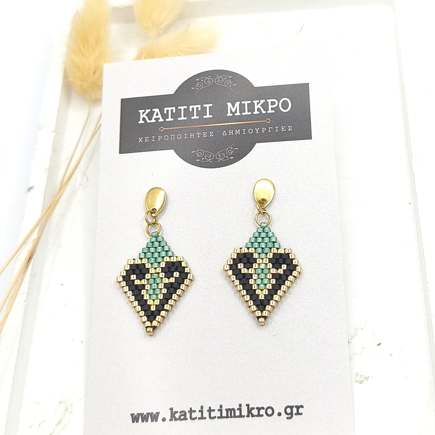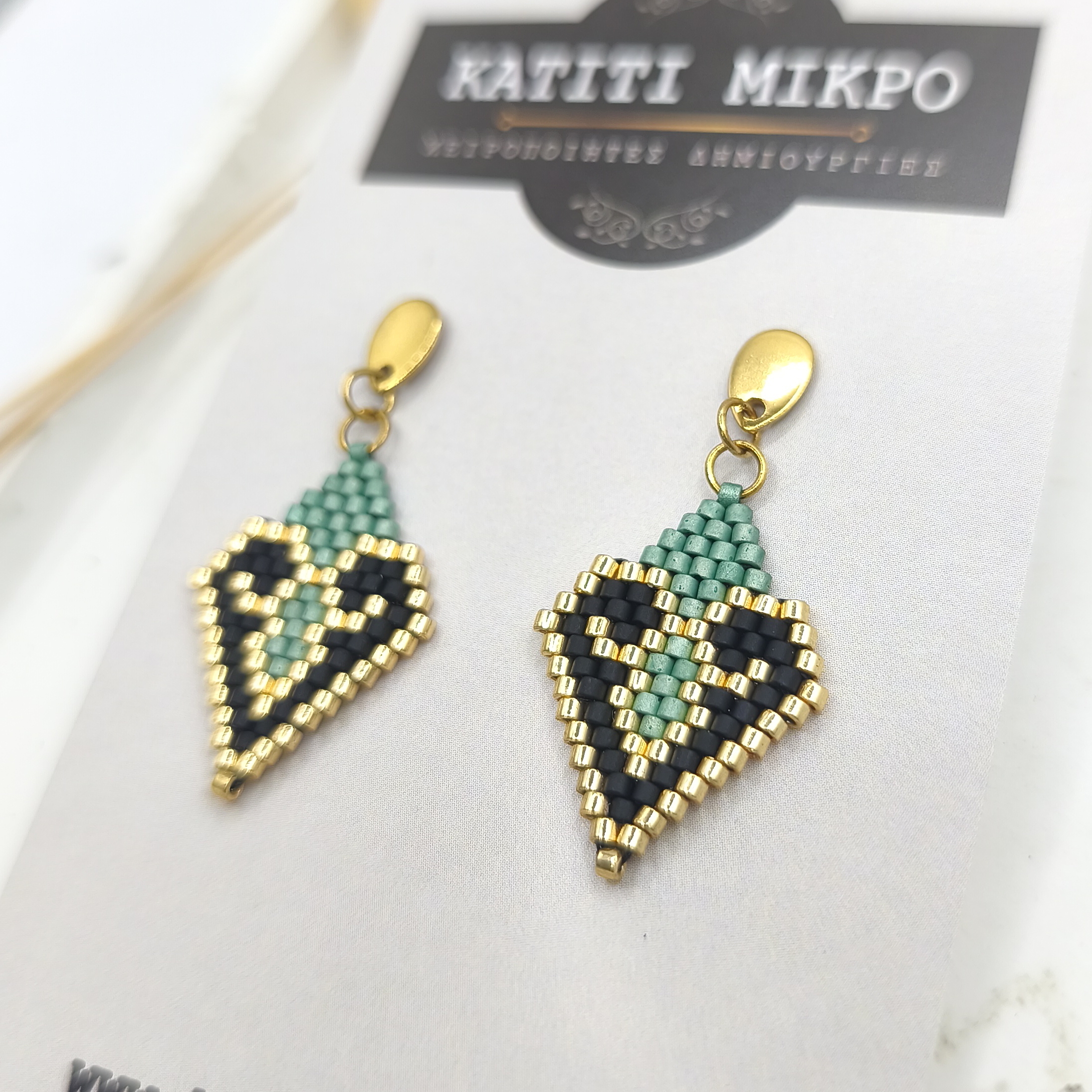 Χειροποίητα σκουλαρίκια με κεντημένες χάντρες miyuki σε μαύρο, χρυσό και μεταλλικό πράσινο