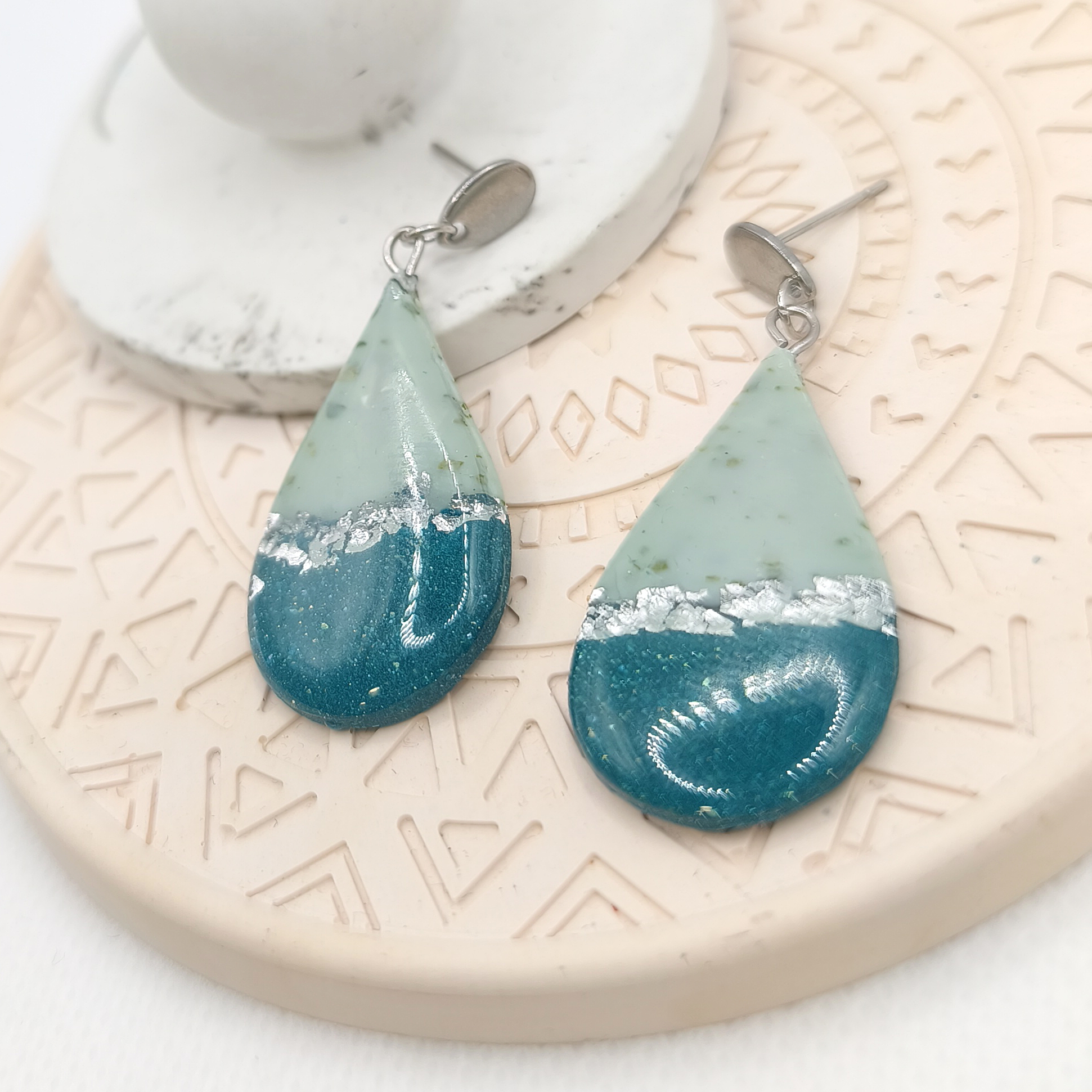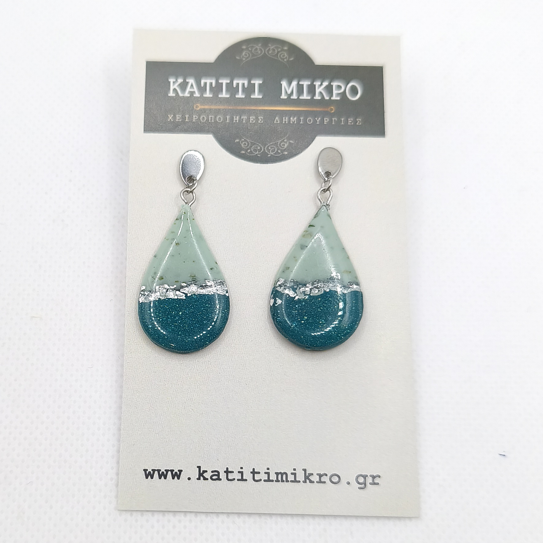 Χειροποίητα σκουλαρίκια πηλού σταγόνες με 2 χρώματα σε αποχρώσεις του πετρολ, φύλλο ασήμι και διάφανο σμάλτο.